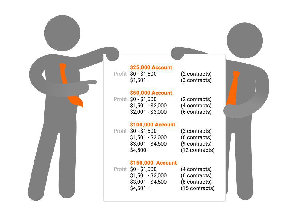 A medida que construyes o pierdes capital, tu poder de compra aumentará o disminuirá según tus pérdidas y ganancias. Esta regla también se calcula en tiempo real. Ejemplo: en la Evaluación con Virtual Starting Capital $25000, si tienes menos de $26500 puedes usar máximo 2 Contratos. Si tienes más de $26500, puedes usar máximo 3 Contratos. Si tienes más de $26500 y tienes una posición abierta de 3 contratos, no debes dejar que caiga por debajo de $26500 con esos 3 Contratos, porque romperías esta regla, ya que se calcula en tiempo real.